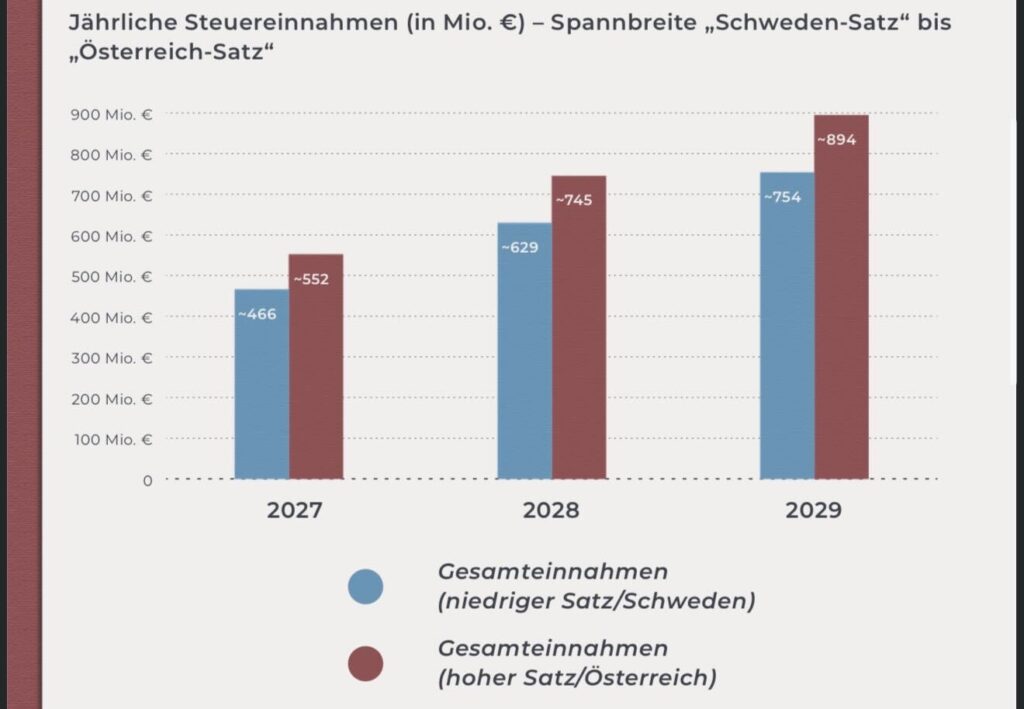 - 2026: 311–368 Mio. € möglich (je nach Steuersatz-Szenario)